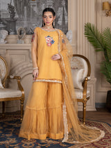Radiate festive elegance in this captivating mustard three-piece ensemble that blends traditional artistry with contemporary grace.