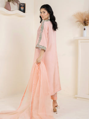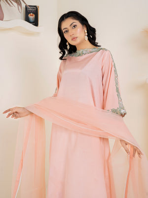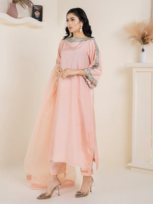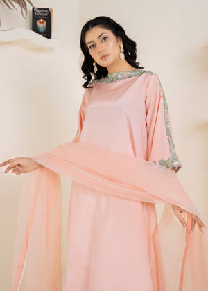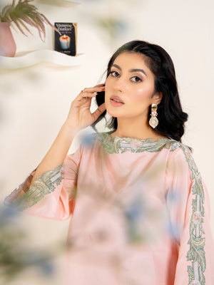A soft peach ensemble that exudes grace and effortless style—crafted to combine elegance with subtle traditional charm.