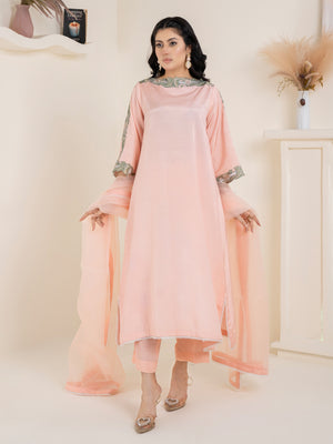 A soft peach ensemble that exudes grace and effortless style—crafted to combine elegance with subtle traditional charm.