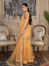 Radiate festive elegance in this captivating mustard three-piece ensemble that blends traditional artistry with contemporary grace.